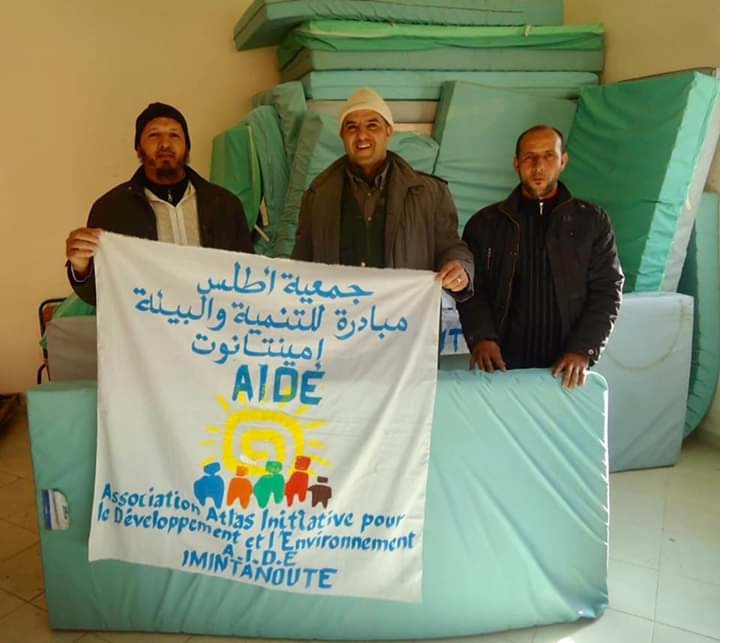 L’association Atlas Initaitive pour le Développement et l’Environnement (AIDE) a organisé le 12 janvier 2020 une caravane de distribution de vêtements, de couvertures et de denrées alimentaires à Imintanoute. Cette opération a été réalisée en partie grâce à des bénévoles de Casablanca inscrits sur la plateforme Nt3awnou et ont envoyés des lots de vêtements d’hiver pour l’association AIDE.